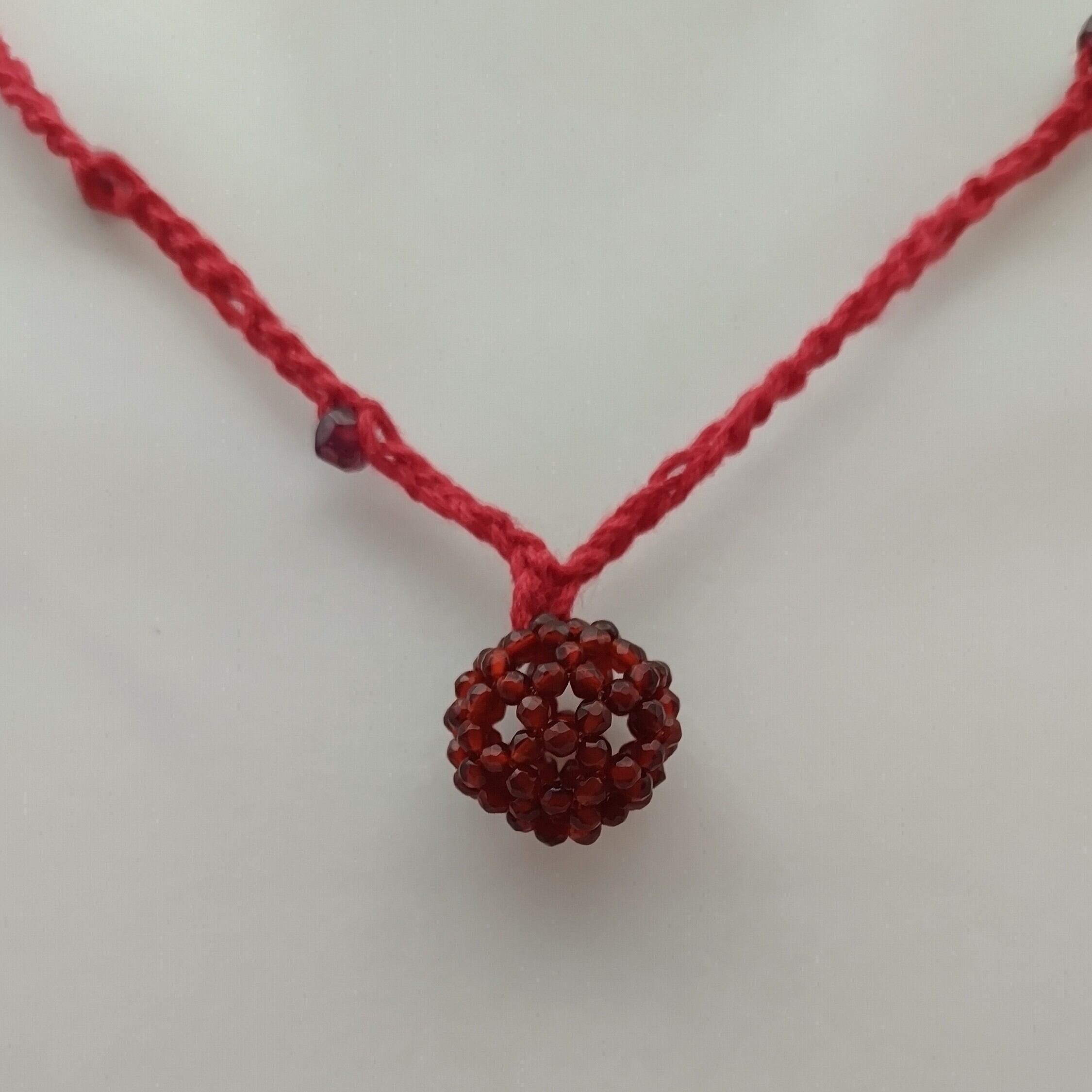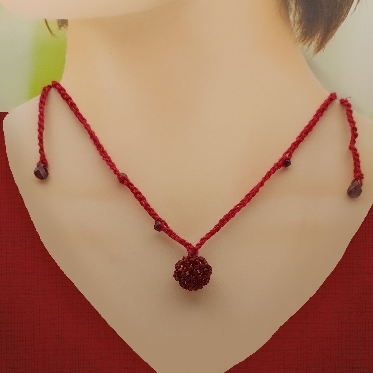 赤い服によく似合う、美しいフラーレンのネックレスです。